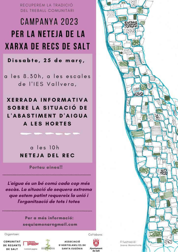 I no oblidem el treball que cal fer també a nivell comunitari per millorar l’eficiència en un moment en que hem passat de tenir aigua tots els dies de l’any a no veure ni una gota durant mesos; de tot a res… i això, a més del trasvals que genera, també a nivell emocional, requereix un esforç d’adaptació i de recerca de nous mètodes de reg i d’emmagatzematge d’aigua, d’organització i de solidaritat entre hortolans/es. Aquí tenim un gran repte!!